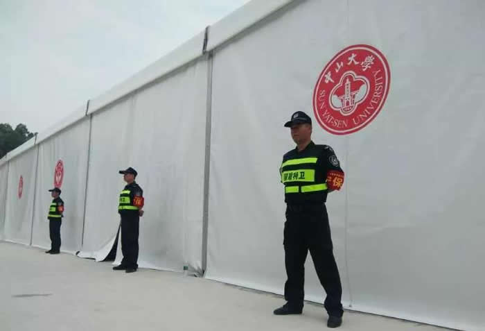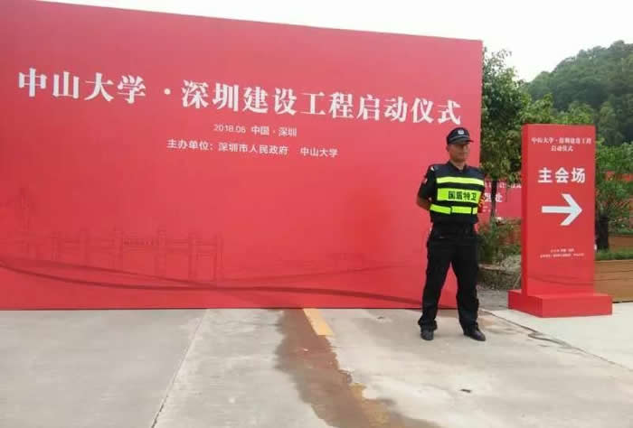 位于深圳市光明新區的中山大學深圳校區建設工程項目啟動儀式于6月12日16點30舉行,國盾特衛保安集團經過建設單位嚴格考核評估,成為中山大學深圳校區建設工程項目安保服務提供單位,專業的安保管理人員及保安人員提前一天進駐啟動儀式及施工現場,實施安全保衛管理和人群控制等安保工作,確保了中山大學深圳校區建設工程項目啟動儀式安全、有序、正常地進行。