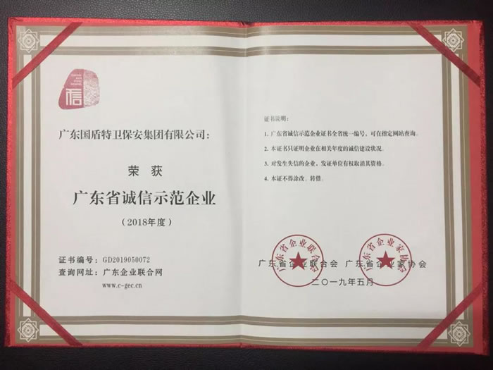 紅5月,廣東國盾特衛(wèi)保安集團有限公司佳訊連連,因為秉承“守誠信、重服務(wù)”的經(jīng)營理念,并將這一理念扎扎實實的落實到日常工作中去,取得了良好的效果,繼5月23日獲授佛山市信用管理協(xié)會、佛山市消費者委員會頒發(fā)的《承諾誠信經(jīng)營企業(yè)》牌匾。5月29日由廣東省企業(yè)聯(lián)合會、廣東省企業(yè)家協(xié)會主辦的“第25屆廣東省企業(yè)家活動日”大會上又傳來佳訊,榮獲《廣東省誠信示范企業(yè)》稱號。