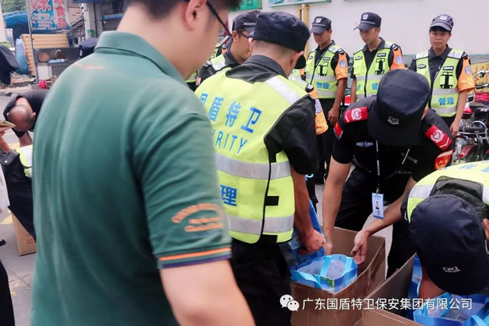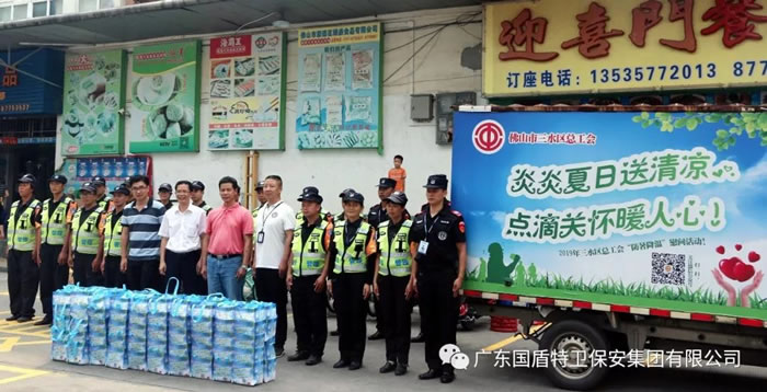 2019年8月23日上午,三水區(qū)總工會副主席鄺剛?cè)纭⑥k公室主任駱永鋒以及三水區(qū)云東海街道總工會專職副主席林斌攜工會工作人員蒞臨國盾特衛(wèi)保安集團(tuán)總部,為辛勤奮斗在高溫執(zhí)勤一線的保安員代表送上了一批清涼飲料等慰問品,送來了深切祝福和關(guān)懷。