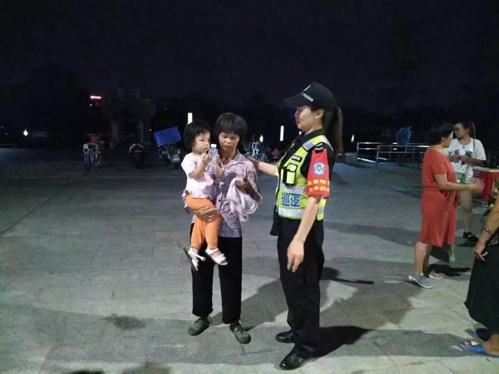 2019年9月11日20點35分左右,國盾特衛蘆苞特勤人員梁肖玲和盤家興在龍坡公園進行巡查時,發現一小女孩與家人走散。兩名隊員立即上前詢問小女孩情況,安撫小女孩情緒,并與周邊群眾合力幫助小女孩順利找回家人。