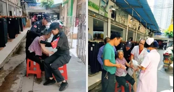 2019年9月27日10點30分左右,國盾特衛蘆苞特勤人員梁肖玲在蘆苞市場巡查中得知惠多惠百貨附近有一老婆婆突然暈倒在地,急需救助。梁肖玲迅速趕往現場,發現有一位年齡約八十歲左右的老婆婆趴倒在地,全身發抖,面部有血,無其他明顯外傷。她立即呼吁周邊群眾幫忙扶起老婆婆并撥打120。隨后,特勤人員鐘文潔和杜桂芬、醫務人員、老婆婆家屬趕往現場,經現場檢查后,老婆婆在家屬和醫務人員的陪同下前往醫院作進一步的檢查。