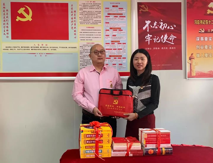 為積極響應(yīng)“推動全民閱讀,建設(shè)書香社會”的國家文化發(fā)展戰(zhàn)略目標(biāo),以創(chuàng)建綜合文化服務(wù)中心為契機(jī),推進(jìn)“兩新”黨組織建設(shè)為抓手,大力整合資源,攜手非公企業(yè)開展多項活動,深入貫徹“不忘初心、牢記使命”主題教育的開展。11月27日早上,三水區(qū)云東海街道組辦在我司黨支部黨建會議室舉行了簡單卻有意義的圖書捐贈儀式,幾十冊捐贈書籍整整齊齊地排列在桌上,顯得格外有厚度、有溫度。我司黨支部書記、集團(tuán)公司董事長夏學(xué)樹接受云東海街道的捐贈,同時云東海街道組辦相關(guān)負(fù)責(zé)人為我司黨支部頒發(fā)給流動黨員“紅色書包”,雙方留影記錄了這一有意義的美好時刻。