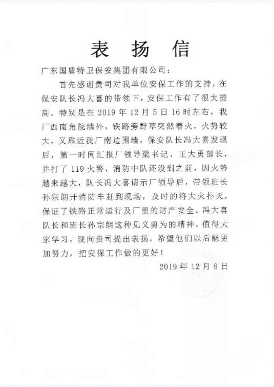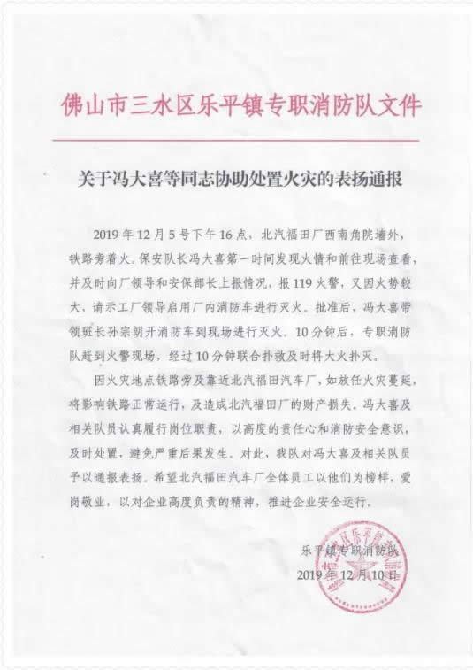 日前,三水區(qū)樂平鎮(zhèn)專職消防隊(duì)和北汽福田汽車廠特向我司和馮大喜等同志發(fā)來了表?yè)P(yáng)通報(bào)。