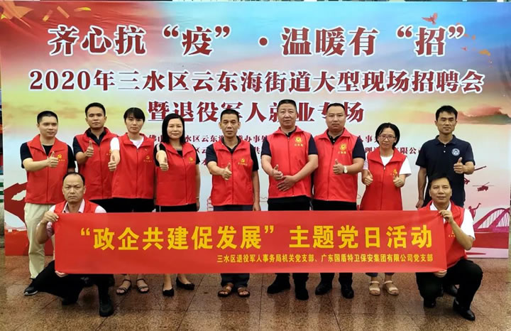 為貫徹落實上級有關(guān)部門的決策部署,強化黨組織之間的交流合作,把“政企共建促發(fā)展”的工作落到實處,促進資源共享、優(yōu)勢互補,助推退役軍人就業(yè)創(chuàng)業(yè),進一步搭建退役軍人與企業(yè)的雙向交流平臺。9月19日當天,三水區(qū)退役軍人事務(wù)局黨支部、廣東國盾特衛(wèi)保安集團有限公司黨支部在三水萬達廣場開展合作共建主題黨日活動暨舉辦退役軍人專場招聘會。