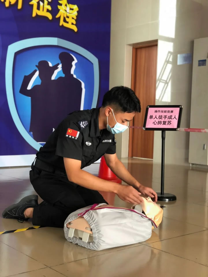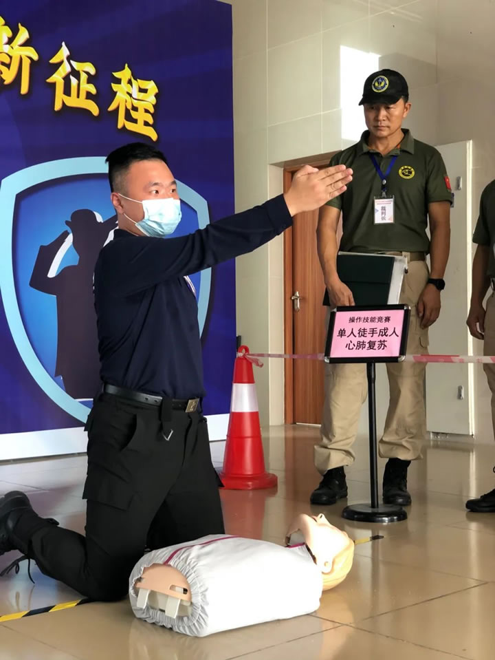 該競賽分為理論知識考核和實操技能考核兩部分。其中,實操技能考核,包括隊列基本動作、現(xiàn)場救護技能(單人徒手成人心肺復蘇)、消防技能(滅火器使用)三項。