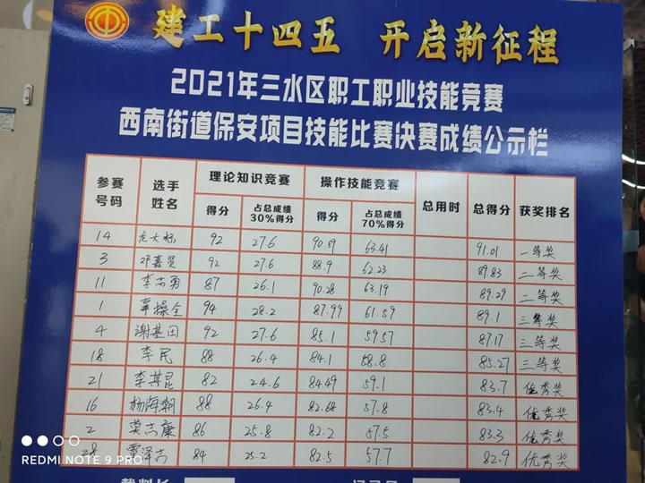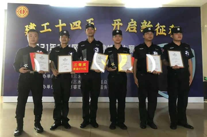 為搭建展示保安職業(yè)技能人才才能的平臺,通過技能練兵、比武競賽,培養(yǎng)一批愛國敬業(yè)、技藝精湛、具有專門技能的人才, 進一步提升保安從業(yè)人員的安全服務(wù)技能,推動行業(yè)整體服務(wù)水平的不斷提高。9月29日, “建功十四五 開啟新征程” — 2021年三水區(qū)西南街道保安員職業(yè)技能競賽在水都基地職工服務(wù)中心舉行。該競賽由佛山市三水區(qū)總工會、西南街道總工會主辦,共有12家單位28名保安員選手參賽,我司代表參賽選手龍大標、鄧嘉賢、李志勇、辜操全、李其昆、楊海潮分別獲得一等獎、二等獎、三等獎、優(yōu)秀獎。