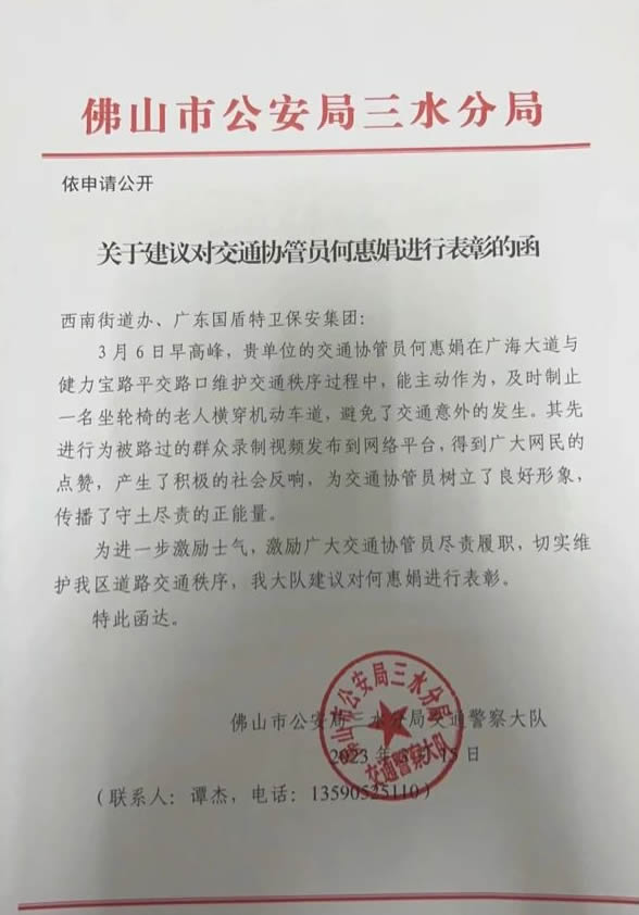 3月6日早高峰時段,在三水城區廣海大道與健力寶平交路口,發生驚險一幕:一名坐著電動輪椅的老人正準備過馬路,卻絲毫沒有留意對面的綠燈已轉紅燈,緩緩地向著不斷有車輛駛過的人行道行進……關鍵時刻,我司派駐的一名交通協管員一個箭步沖上去,快速扶上并剎住了老人家的電動輪椅,及時化險為夷。這一幕被路人的行車記錄儀記錄下來,并以《你沖過去的樣子真帥!10086個點贊》為題在網上發表了帖子,產生了積極的社會反響,獲廣大網友跟帖點贊!