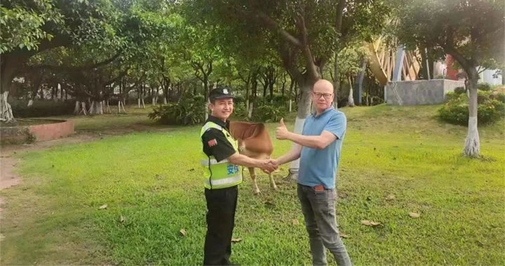 4月20日下午15時33分,我司派駐的協(xié)管人員王榮在日常巡查時發(fā)現(xiàn)有一頭牛在大塘鎮(zhèn)興唐崗亭附近四處游走、無人看管,疑似農(nóng)戶丟失。為防止阻礙交通,隊員王榮立即將其牽引到安全位置,并系好牛繩,不讓“迷路”牛再次走丟。同時,為盡快找到失主,防止群眾財產(chǎn)損失,隊員王榮隨后拍下牛的照片,上傳至微信工作群,并將具體情況報告給上級部門負責人。大塘鎮(zhèn)執(zhí)法辦領(lǐng)導得知此事后,立即聯(lián)系鎮(zhèn)農(nóng)辦相關(guān)負責人,讓其協(xié)助幫忙將“迷路”牛照片通過微信發(fā)送至附近的村委干部幫忙辨認、查找失主。一個小時后,經(jīng)村民辨認,牛可能是黃某(化名)家的,大塘鎮(zhèn)執(zhí)法辦立即聯(lián)系黃某,經(jīng)與黃某核對了牛的特征后,確認牛的確是黃某家所丟,隊員王榮將牛歸還給黃某。牽著失而復得的牛,黃某難掩喜悅,連聲道謝。隨后,隊員王榮提醒黃某今后放牛后要多加注意,栓好繩子,避免再次走失。
