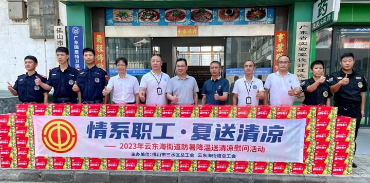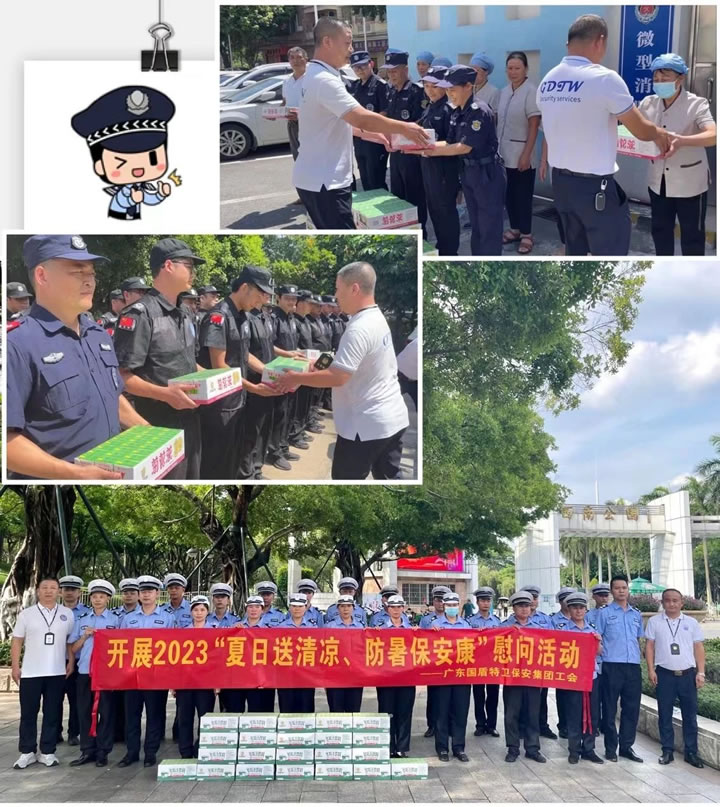 在三水區總工會、云東海街道黨工委的支持下,為將集團公司對員工的關心關愛送到一線,貫徹落實基層一線防暑降溫措施,自7月份起,集團公司工會組織開展“夏日送清涼、防暑保安康”活動,集團公司黨支部書記、董事長夏學樹親自部署,要求服務管理部各級管理人員落實傳達公司的關心關愛精神,以關心一線隊員工作和生活為出發點,各護衛點負責人結合夏日實際科學合理安排崗位,叮囑一線隊員加強自我防護,及時補充水分,時刻關注自身健康狀況,積極投身協助維護治安、城市管理創文建設工作中去,繼續發揚特別能吃苦、特別能奉獻、特別能戰斗的優良作風,高質量做好駐點安保服務。