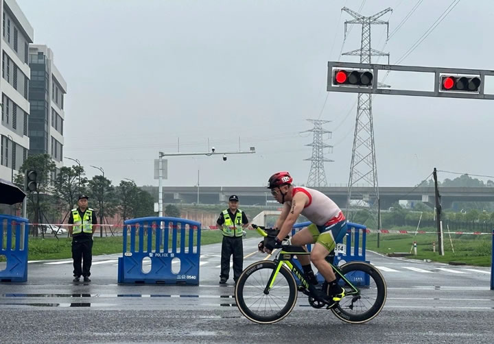 “大鐵人”賽事期間天空陰沉、烏云密布,滂沱大雨傾盆而下。然而,這場不期而至的雨水并沒有澆滅參賽者們的熱情,反而更加激發了他們的斗志。在賽場各賽段,安保隊員門始終堅守崗位、嚴陣以待,“大鐵人”選手們在雨中激情競逐,保安員們繃緊安全弦,時刻關注選手和群眾安全。