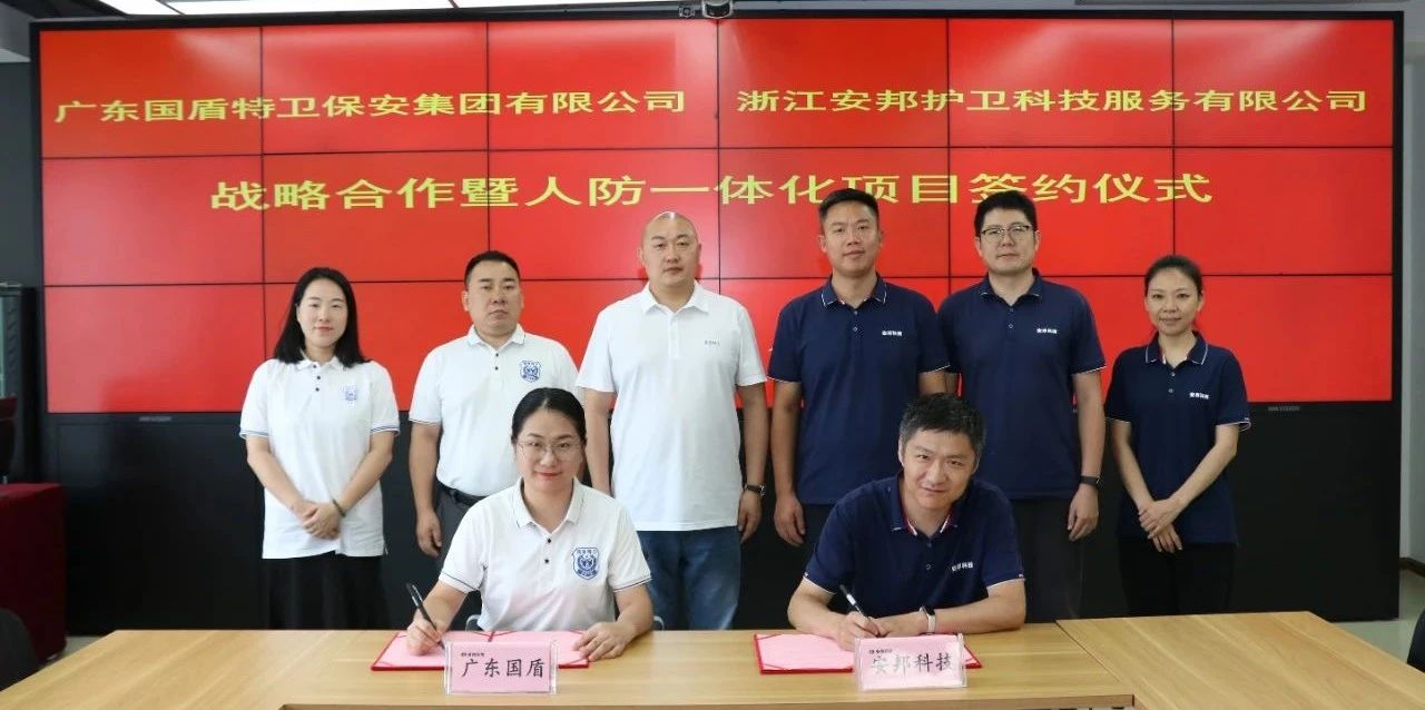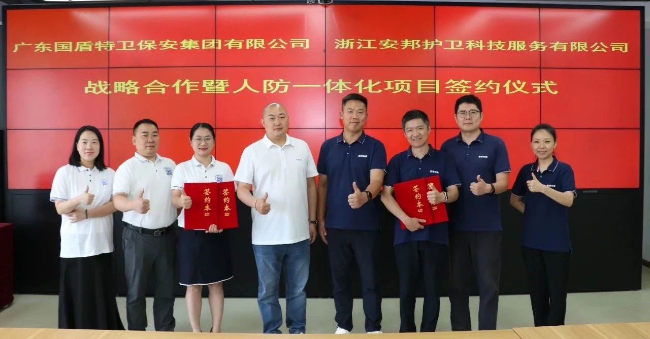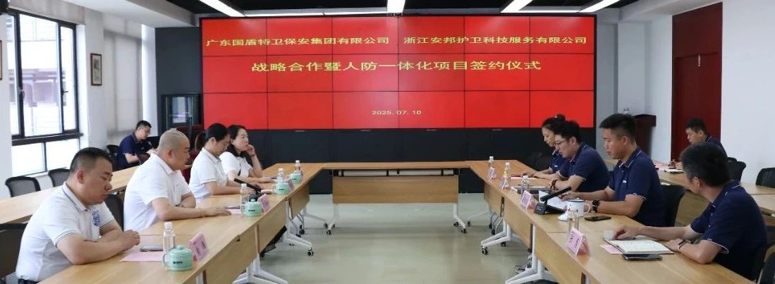 為加速構(gòu)建全域化安全服務(wù)體系,推動保安行業(yè)數(shù)字化轉(zhuǎn)型,2025年7月10日上午,廣東國盾特衛(wèi)保安集團(tuán)有限公司與浙江安邦護(hù)衛(wèi)科技服務(wù)有限公司在杭州正式簽署戰(zhàn)略合作協(xié)議及人防一體化項(xiàng)目協(xié)議。此次合作是繼今年1月集團(tuán)黨支部書記、董事長夏學(xué)樹率隊(duì)赴浙考察后,雙方在科技賦能安保領(lǐng)域邁出的實(shí)質(zhì)性步伐。